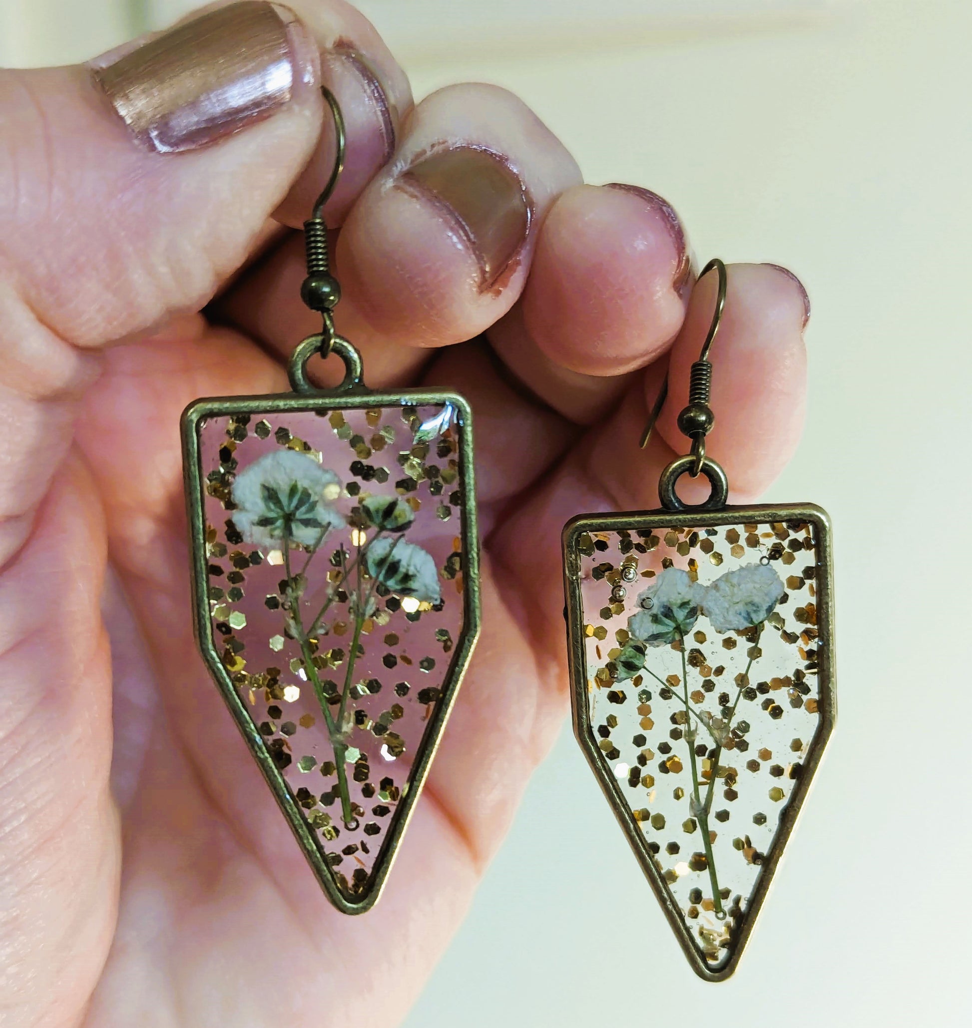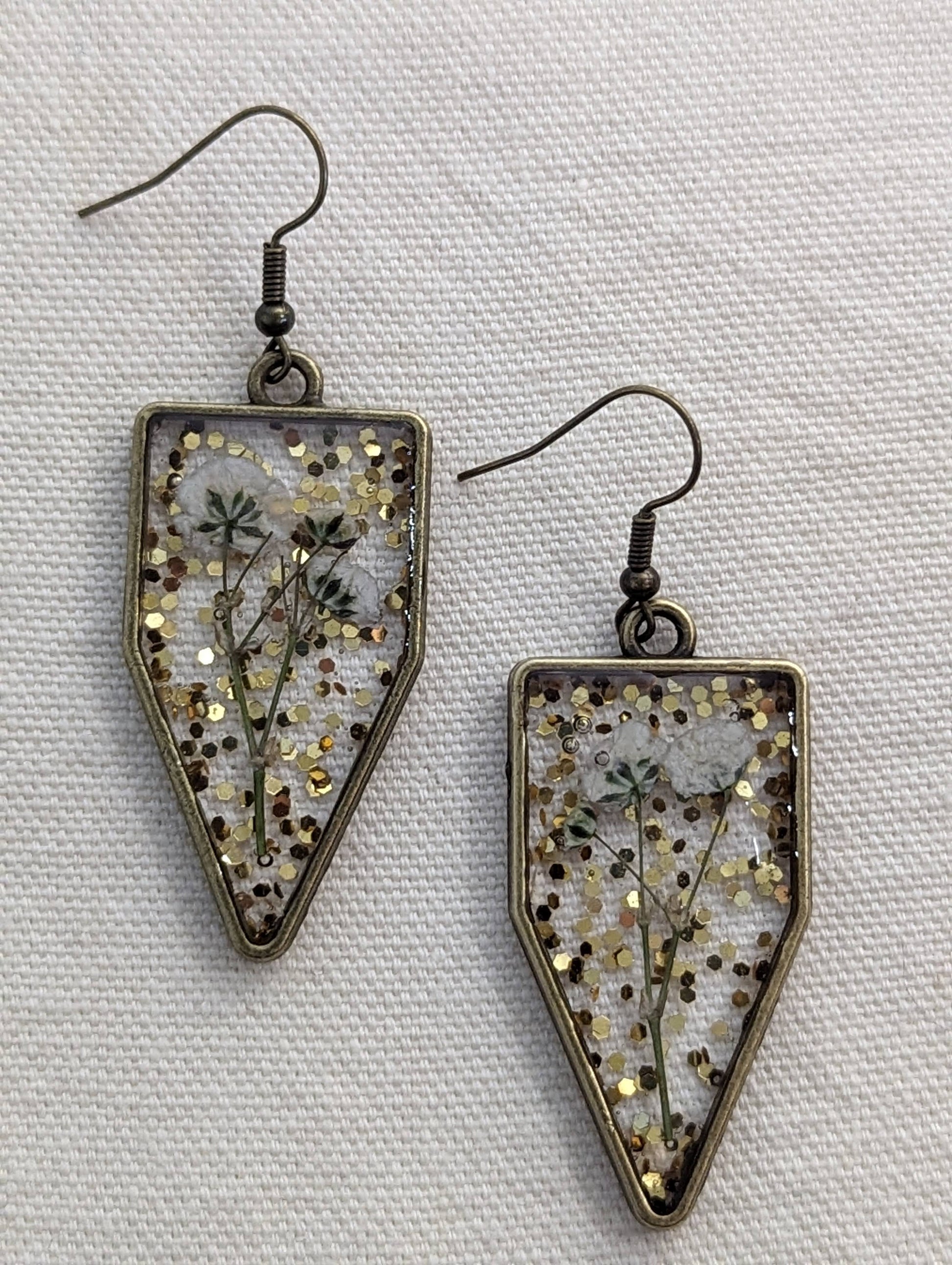 Real Baby's Breath & golden glitter preserved in hand poured resin, in an antique bronze frame.