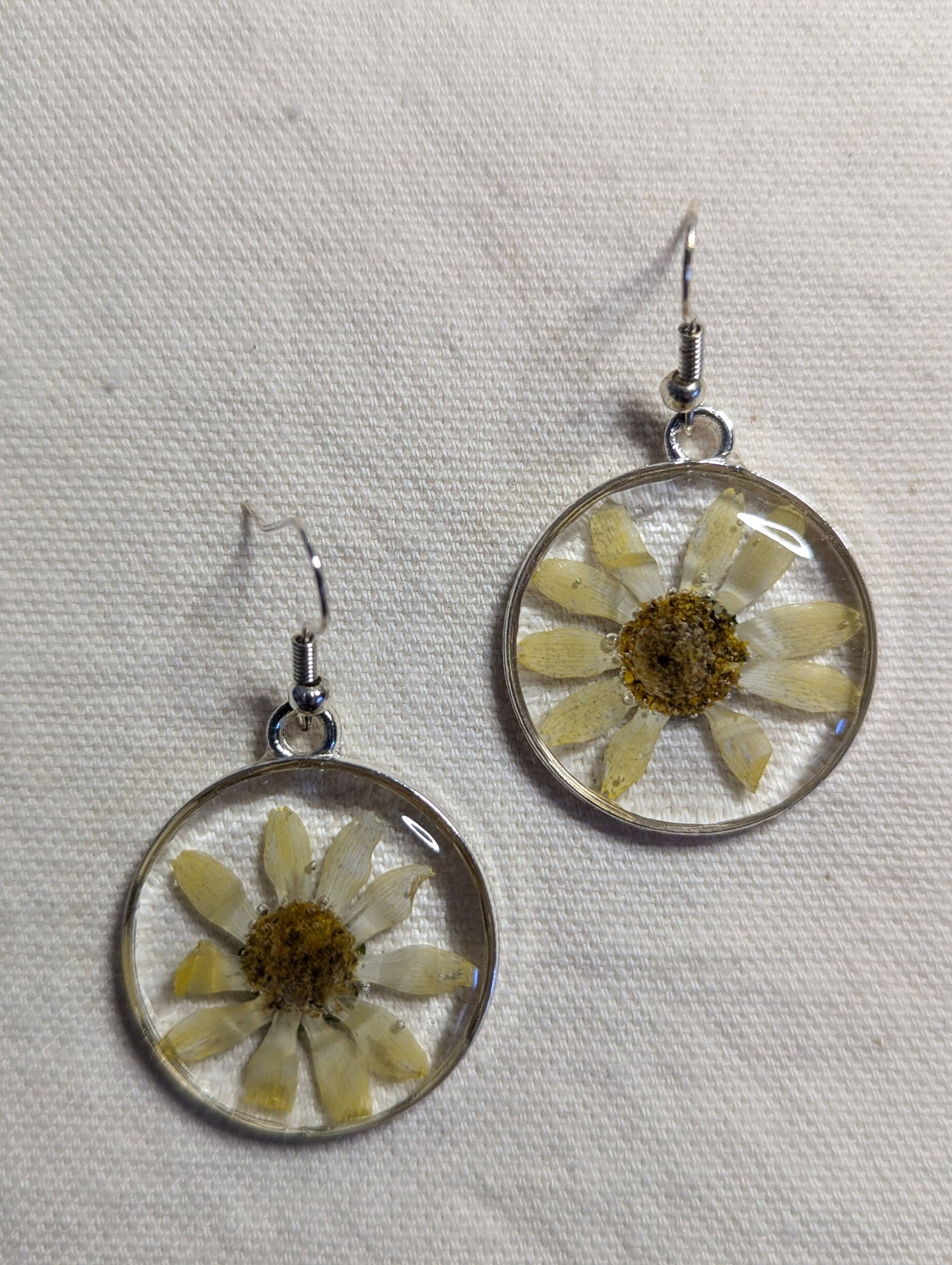 Real Daisies preserved in hand poured resin in a silver frame.