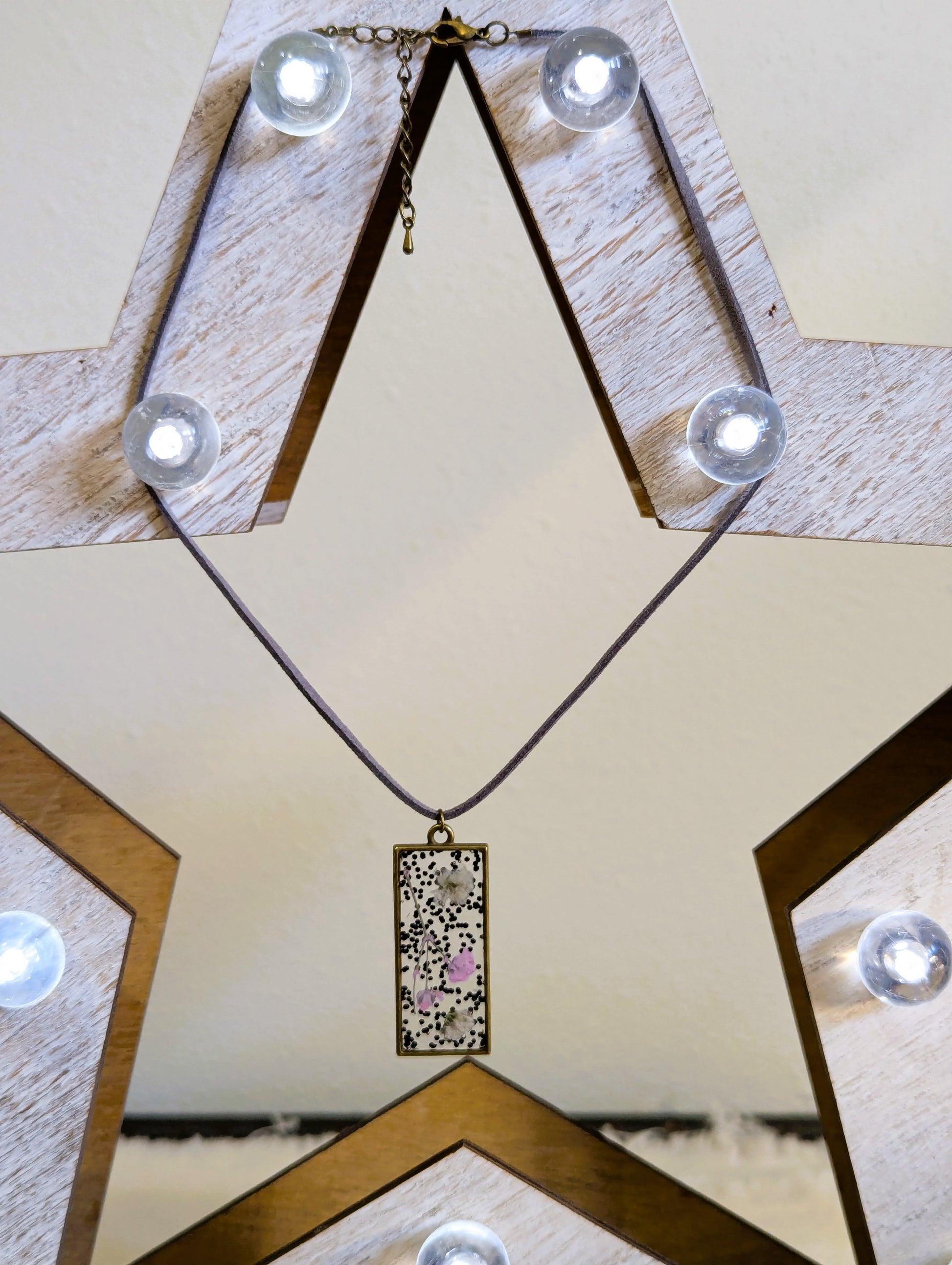 Pink & White Baby's Breath and Glitter Rectangle Necklace